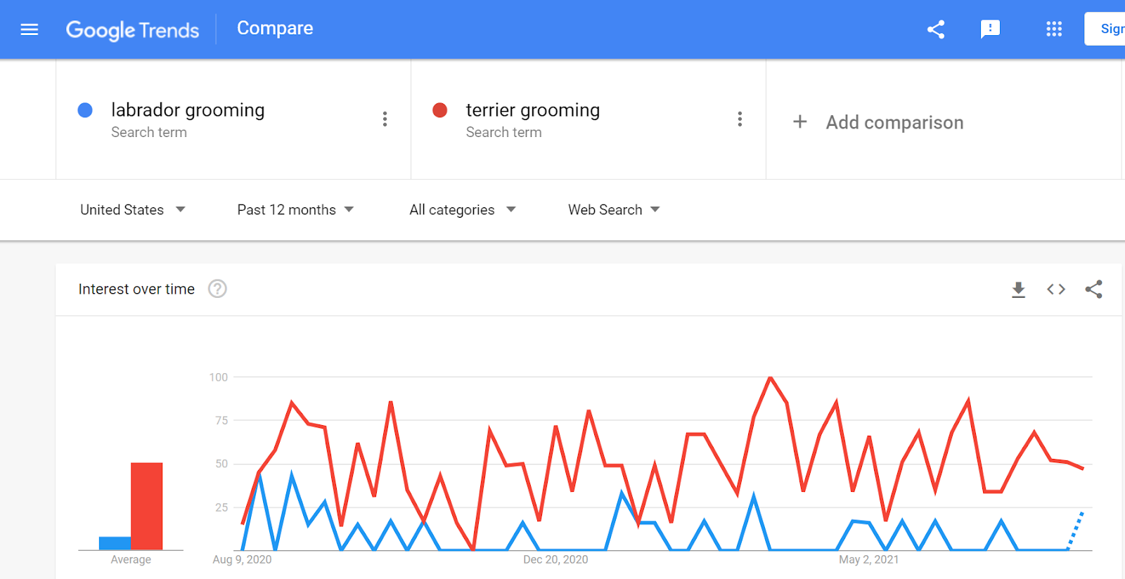 In that case, as thedogblog.com, which keyword would you target? ‘Labrador grooming’ or ‘terrier grooming’? Google trends has the answer.